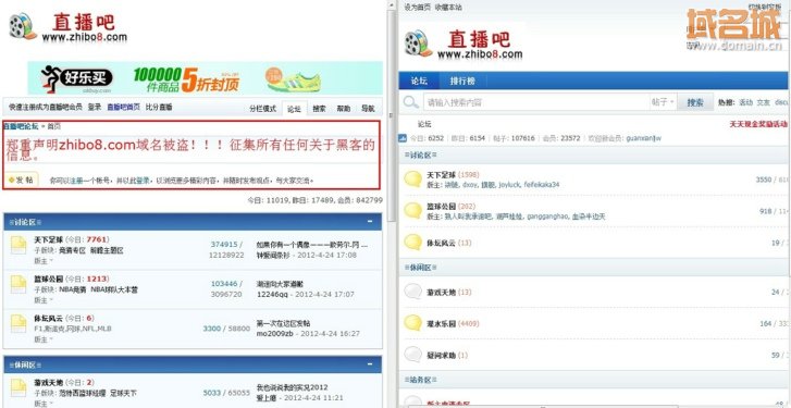 ![]() 左邊為真直播吧頁面,右邊為假直播吧頁面(刊登了許多非法賭球、網(wǎng)絡(luò)賭博等廣告) 除此之外,冒牌“直播吧”還借用原直播吧論壇域名bbs.zhibo8.com另立論壇,目前該論壇注冊(cè)會(huì)員數(shù)已經(jīng)超2萬人,原因在于這個(gè)冒牌論壇謊稱數(shù)據(jù)丟失,讓用戶重新注冊(cè),可見仍有不少不知情的原直播吧(zhibo8.cc)會(huì)員誤入此網(wǎng)站。在此,筆者也提醒廣大用戶,目前直播吧的官方論壇域名為bbs.zhibo8.cc,論壇數(shù)據(jù)并沒有丟失,并且在論壇上有直播吧被盜的通告,望看到此篇報(bào)道的用戶相互轉(zhuǎn)告,讓那些進(jìn)入冒牌論壇的用戶能夠“回家”。