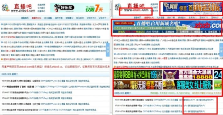 | 還記得今年愚人節(jié)那天直播吧域名zhibo8.com被盜的事件嗎?目前被盜域名不僅未被追回,冒牌“直播吧”更是借用直播吧原域名zhibo8.com做出更加過分的事情,今日,筆者在訪問冒牌“直播吧”時(shí)發(fā)現(xiàn)該網(wǎng)站貼出通告,將更換域名zbzb.com,此舉無疑是想掏空直播吧的用戶群體,讓不知情的直播吧用戶黏合在新域名上。