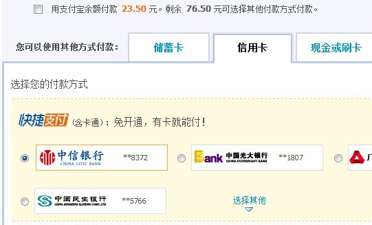 選擇支付寶之后,還可以選擇儲(chǔ)蓄卡、信用卡等進(jìn)行支付
