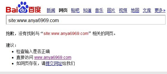 我正在優(yōu)化的一個(gè)網(wǎng)站,優(yōu)化詞:廣告扇、廣告扇子、廣告扇廠,網(wǎng)址:www.anya6969.com,排名一下在第一頁。今天早上,客戶給我打電話說,網(wǎng)站在百度里找不到了。我趕緊上百度搜索查詢: