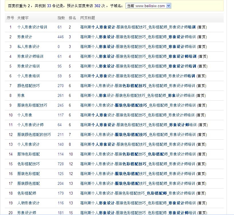 ![]() 基本上這些關(guān)鍵詞都是有一定百度指數(shù)的,其中不乏熱門詞,也有一些長尾詞,總的來說還算不錯(cuò),每天有200個(gè)左右的IP。因?yàn)槭瞧髽I(yè)站,而且剛起步,所以要求不是那么高,后期還有很大的進(jìn)步空間。 步入正題, 今天就系統(tǒng)的講一下網(wǎng)站優(yōu)化的三步曲: 第一步: 網(wǎng)站標(biāo)題優(yōu)化 網(wǎng)上有關(guān)標(biāo)題優(yōu)化的文章很多,我只說重點(diǎn),我認(rèn)為其中的關(guān)鍵在于其對分詞技術(shù)的把握,以及長尾詞帶動(dòng)熱門詞,標(biāo)題合理重復(fù),并且還要考慮到標(biāo)題的吸引力。 網(wǎng)站的標(biāo)題寫法和排名是沖突的,因?yàn)閷懙奈,勢必?huì)遺失掉一部分有價(jià)值的關(guān)鍵詞,很多站長,包括我也會(huì)有一個(gè)取舍的過程。我的建議是前期以流量和權(quán)重為主,后期可以適當(dāng)?shù)那械粢恍╅L尾詞改成吸引眼球的品牌詞,就類似于麥包包的優(yōu)化策略。 而在選詞上,不能盲目的依照自己的心理想法去選(大多數(shù)企業(yè)站的通病),而是要站在用戶的角度去想,其次還要考慮到一些重要的指標(biāo): 百度指數(shù)》首頁競價(jià)位個(gè)數(shù)》首頁頂級(jí)域名個(gè)數(shù)》頂級(jí)域名的標(biāo)題關(guān)鍵詞排序情況》百度子產(chǎn)品占位情況》百度索引數(shù)量。 根據(jù)這些指標(biāo),來敲定你的關(guān)鍵詞,很多企業(yè)站的另一個(gè)通病就是想把所有詞都做了,那怎么可能呢?根據(jù)權(quán)重的分配規(guī)則,標(biāo)題中最先出現(xiàn)的關(guān)鍵詞權(quán)重最高,所以按照選詞的方法,根據(jù)難度和熱度依次排開。 而且標(biāo)題關(guān)鍵詞的個(gè)數(shù)最好不要超過4個(gè),3個(gè)左右最為合適。前文中講到的分詞技術(shù)以及長尾帶動(dòng)熱門,標(biāo)題合理重復(fù)就尤為重要了,如何通過3-4個(gè)關(guān)鍵詞,衍生出幾十個(gè)關(guān)鍵詞,就是對關(guān)鍵詞選取技術(shù)的最好體現(xiàn)。 小技巧:把核心的關(guān)鍵詞,在頭部和尾部適當(dāng)?shù)闹貜?fù)一次,對核心關(guān)鍵詞排名是有顯著的提高作用的。 小結(jié):有關(guān)標(biāo)題的還有很多,就不過多去說了,以上是比較關(guān)鍵的點(diǎn),還是重申一遍,網(wǎng)站的標(biāo)題選則對后期的優(yōu)化起到?jīng)Q定性的作用,一定要慎重,仔細(xì)。 第二步:網(wǎng)站內(nèi)容建設(shè) 網(wǎng)站的內(nèi)容大家都知道很重要,每日定時(shí)穩(wěn)定原創(chuàng),偽原創(chuàng)等等,但很多的人在做內(nèi)容的時(shí)候忽略了最重要的一個(gè)東西,且聽我細(xì)細(xì)道來。 我們都知道網(wǎng)站的資源是有限的,什么意思呢,比如說你的友情鏈接指向的錨文本,每天最多1-2個(gè)友鏈,所以在有限的資源下,關(guān)鍵詞的排名必須要分階段進(jìn)行,同理,你的內(nèi)容也必須要分階段去撰寫。 舉例:第一階段你的外鏈錨文本都指向了“形象設(shè)計(jì)”這個(gè)詞,而你的網(wǎng)站內(nèi)容卻更新的大多數(shù)是色彩搭配、服裝搭配的文章,你說效果能好么? 所以內(nèi)容的建設(shè),并不是原創(chuàng)就可以了,而是要根據(jù)關(guān)鍵詞的階段排名計(jì)劃,分階段的去圍繞核心關(guān)鍵詞展開譜寫內(nèi)容,保證每個(gè)階段的大量外鏈錨文本背后,有相當(dāng)?shù)膬?nèi)容做支撐,這樣你的外鏈效益才能最大化,搜索引擎才會(huì)真正認(rèn)可你網(wǎng)站的權(quán)威性。 在這一點(diǎn)上,真正做的好的網(wǎng)站,我見的不多,有一些站長并不是不懂這個(gè)道理,而是刻意忽略,為什么呢?因?yàn)闉槊恳粋(gè)階段的關(guān)鍵詞去專門的寫足夠的內(nèi)容,是很辛苦的事情,很多站長不喜歡這么累,所以都是想到哪寫到哪,去A網(wǎng)站抄一點(diǎn)偽造一下,然后再去B網(wǎng)站抄一點(diǎn)偽造一下,每天更新的量雖足,但是很雜,對核心關(guān)鍵詞排名的促進(jìn)起不到一個(gè)決定性的作用。 小結(jié):步入2012年以來,我們都知道搜索引擎對網(wǎng)站的內(nèi)容質(zhì)量越來越看重,內(nèi)容所給予的權(quán)重也越來越高,但切記不可盲目的去更新內(nèi)容,而是要每個(gè)階段的計(jì)劃去更新內(nèi)容,這樣關(guān)鍵詞的排名才會(huì)有質(zhì)的變化。 第三步:外鏈建設(shè) 常規(guī)的外鏈我也不多說了,大家都是重復(fù)在做,我只說兩點(diǎn)比較關(guān)鍵的。 1.友情鏈接的導(dǎo)出控制,很多網(wǎng)站,權(quán)重沒多少,導(dǎo)出卻達(dá)到30-40個(gè),甚至更多,每天卯足了勁到處換鏈接,對于這樣的站長,給你個(gè)忠告,真的沒用,蛋糕原理沒聽說過嗎?你網(wǎng)站總共就那么點(diǎn)權(quán)重,你全都分出去了,你靠什么去排名?所以友情鏈接真的在精不在多,很多站友情鏈接只有幾個(gè),但排名很穩(wěn)固,因?yàn)榫W(wǎng)站的權(quán)重非常集中。 切忌不可盲目追風(fēng),看著競爭對手有幾十個(gè)友情鏈接,以為自己數(shù)量上少了所以排名才不好,所以拼命的去換,我的網(wǎng)站至今才11個(gè)導(dǎo)出鏈,我還嫌多了,排名一樣很穩(wěn)固。 2.鏈接的穩(wěn)定性。老生常談了,鏈接不穩(wěn)定,一直在下滑,排名就一直波動(dòng),鏈接穩(wěn)步上升,排名也同樣穩(wěn)步上升。這里的建議是,論壇回帖基本可以放棄了,每周做幾個(gè)即可,因?yàn)檎搲靥姆(wěn)定性實